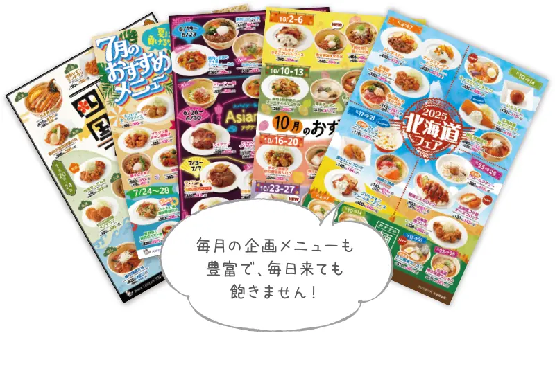 朝食から夕食まで食べることができます。シーズンメニューや、全国ご当地メニューなどの企画も大人気!