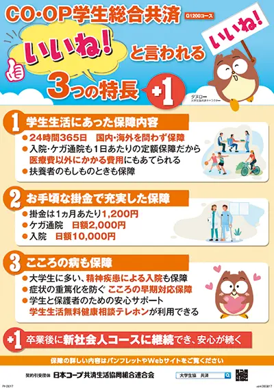 学生生活の様々なリスクにそなえる学生どうしのたすけあいの保障制度です。