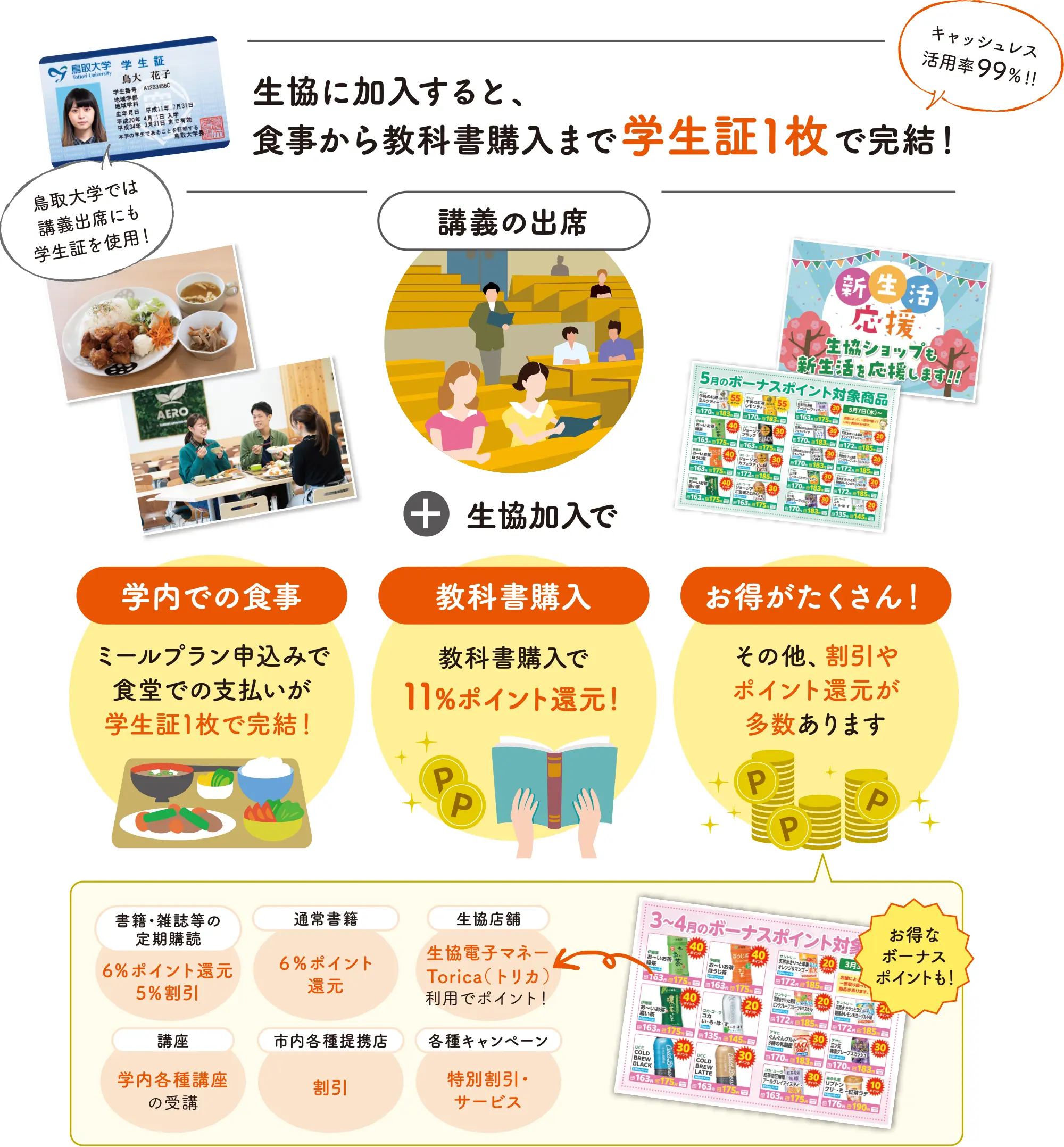 大学生協は、鳥取大学の学生・教職員が出資金を出し合って運営し、大学の中で福利厚生を担っている協同組合です。鳥大生の97%以上の方が加入しており、店舗や食堂を利用されています。