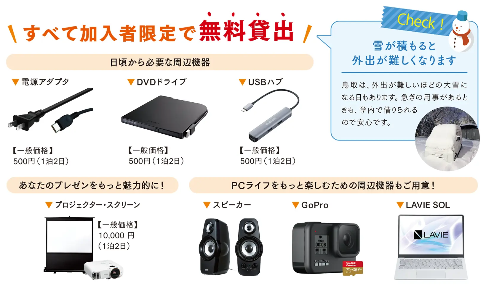 家に充電器を忘れてしまった…。ゼミで発表する時にアダプターがない…。こんな時もサポートパックに入っていれば安心です。普段あまり使わないけど、あると便利な周辺機器や高価で購入できない機器など、サポートパック加入者であれば無料で貸出しできます。購入前に使えるか試してみたいという方もお待ちしております。