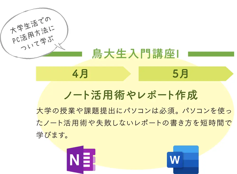 新入生の皆さん、ようこそ!これから始まる大学生活を充実させるための第一歩として、私たち鳥大生の先輩と一緒に学びませんか?この講座では、パソコンの基本操作や便利な活用方法を学びながら、同じ目標を持つ仲間と交流を深めることができます。鳥大生が作成した新入生のための講座なので安心して参加できる内容になっており、講義の受け方以外にも日常生活で役立つスキルが身につきます。新しい仲間との絆を深めながら、楽しく学びましょう!