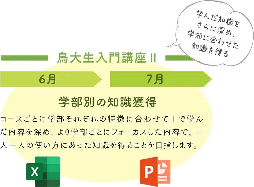 鳥大生入門講座Ⅱでは各学部で特に必要になってくる内容について学びます。共通の使い方だけでなく各学部の学びに合わせた知識を習得することで、学びやすく、自身にあった使い方をすることが出来ます。