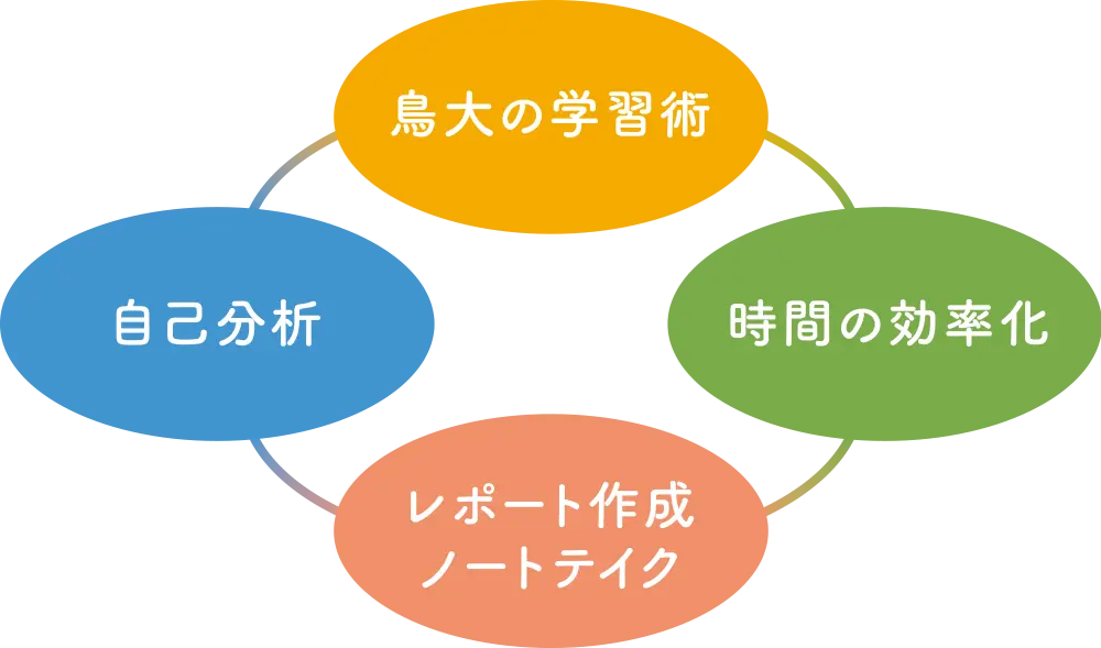 本講座では、これらの授業を効率よく学ぶためのポイントを鳥大生の先輩の経験をもとに作成しています。